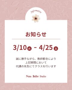 みなさん、こんにちは! Nana Ballet Studioです♪ スタジオですが、 ・6月29日(木) ・6月30日(金)は、第5週目のため、お休みとなります。 ご用の際は、下記【問い合わせ方法】よりご連絡 […]